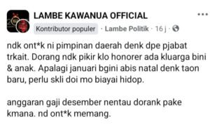 pionnews.com – Kepala Badan Keuangan Dan Aset Daerah (BKAD) Kota Manado, merespon sebuah postingan oleh salah satu netizen pada grup media sosial facebook Lambe Kawanua Official terkait dengan lambatnya pembayaran gaji para honorer di Pemerintahan Kota Manado.