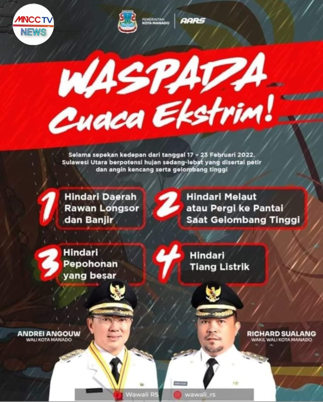 “Kami mengimbau masyarakat untuk tetap waspada, terutama bagi yang tinggal di daerah rawan banjir, tanah longsor, dan pohon tumbang. Pastikan saluran air tetap lancar dan hindari berteduh di bawah pohon saat hujan deras,” ujar Plt.Kepala Dinas Komunikasi dan Informatika (Kominfo) Kota Manado Erwin Kontu.