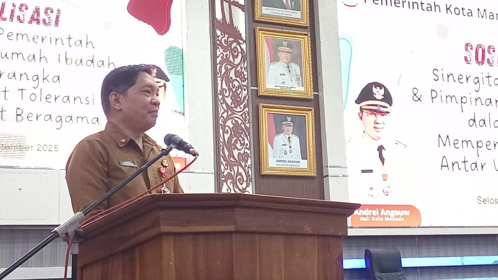 pionnews.com – Sekertaris Daerah Kota Manado, dr Steaven Dandel, M.Ph.,memberikan penjelasan terkait pembangunan Instalasi Pengolahan Lumpur Tinja (IPLT) di TPA Sumompo. Hal ini disampaikannya saat membuka kegiatan Sosialisasi Sinergitas Pemerintah dan Pimpinan Rumah Ibadah dalam Memperkuat Toleransi Antarumat Beragama, Selasa (23/9/2025), di Gedung Serbaguna Kantor Wali Kota Manado.