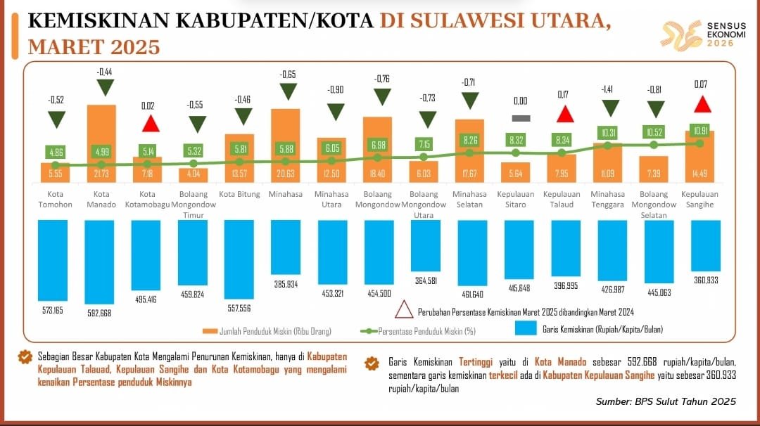 Data BPS Provinsi Sulawesi Utara menunjukkan bahwa pada Maret 2025, persentase penduduk miskin di Sulut mencapai 6,71 persen, dengan garis kemiskinan sebesar Rp 530.304 per kapita per bulan. Tren positif di Kota Manado turut berkontribusi terhadap penurunan angka kemiskinan ekstrem di tingkat provinsi yang rata-ratanya turun 0,43 persen.
