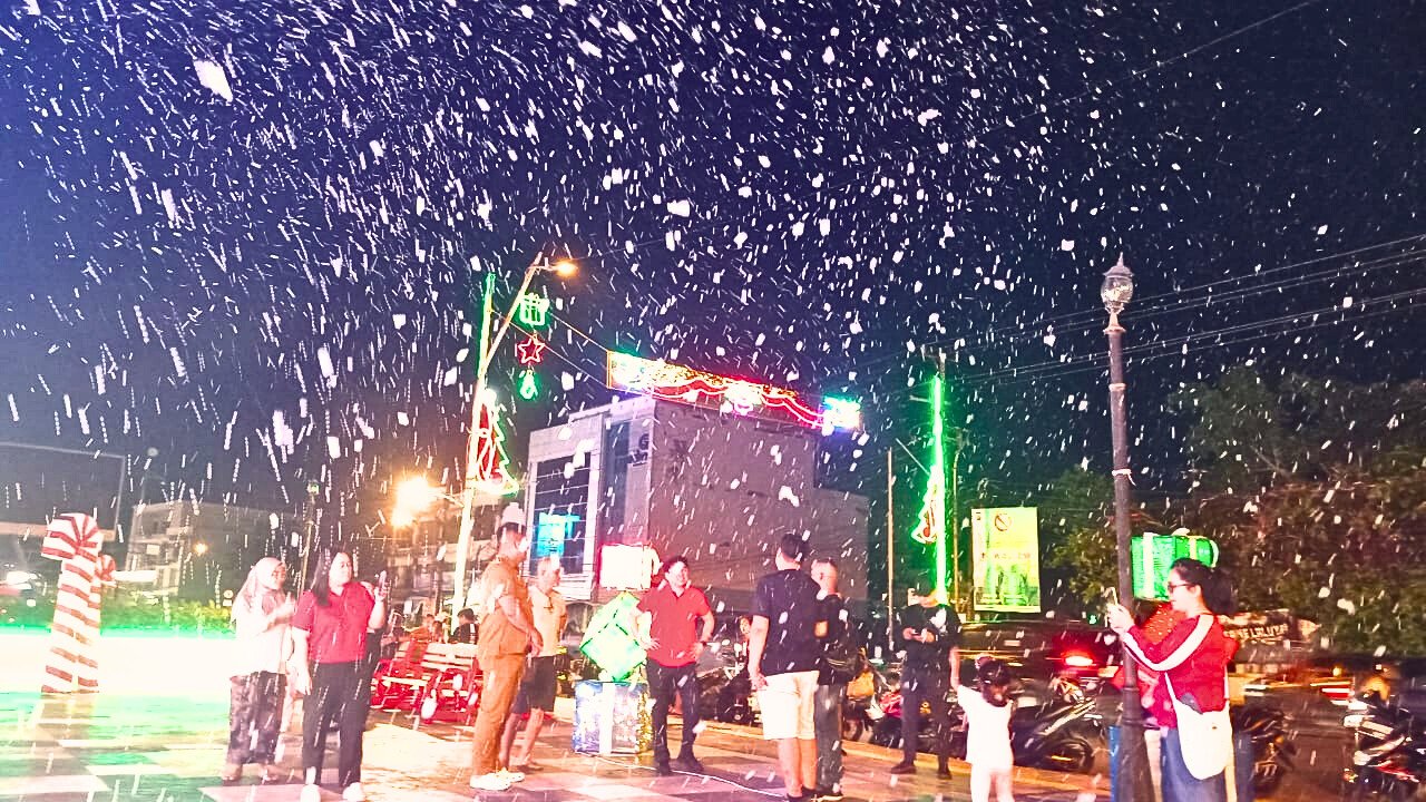 Hiasan Natal yang dipadukan dengan efek salju menciptakan suasana hangat sekaligus magis, menghadirkan pengalaman visual yang mengundang warga untuk menikmati kebersamaan di penghujung tahun, khususnya di kawasan pesisir Boulevard Manado.