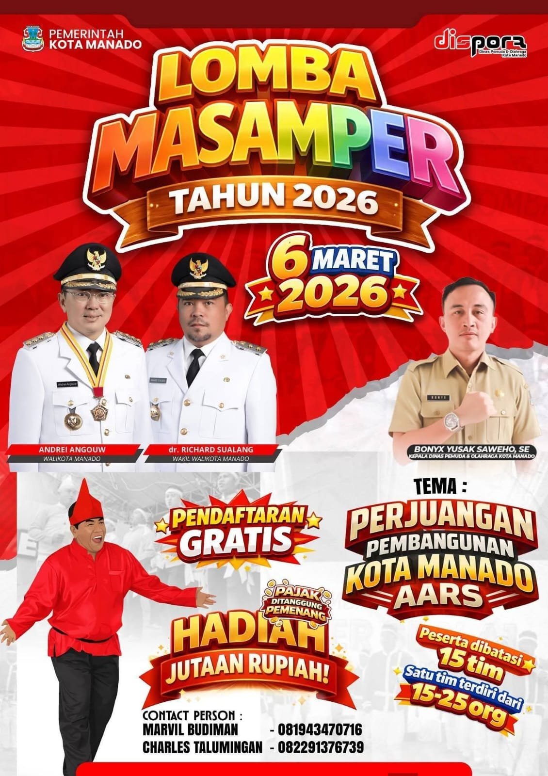 pionnews.com – Pemerintah Kota Manado akan menggelar Lomba Masamper pada Jumat, 6 Maret 2026, bertempat di Aula Pemkot Manado mulai pukul 18.00 Wita. Kegiatan ini dipastikan berlangsung meriah karena memperebutkan hadiah uang tunai bagi juara 1 hingga juara 8. Seluruh pemenang akan mendapatkan uang pembinaan sebagai bentuk apresiasi.